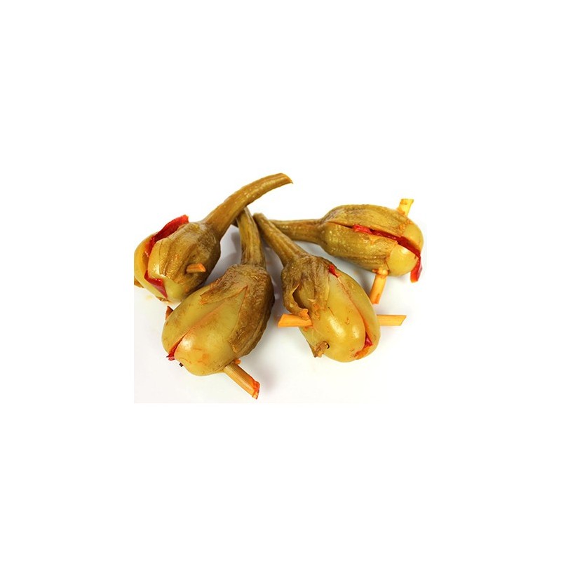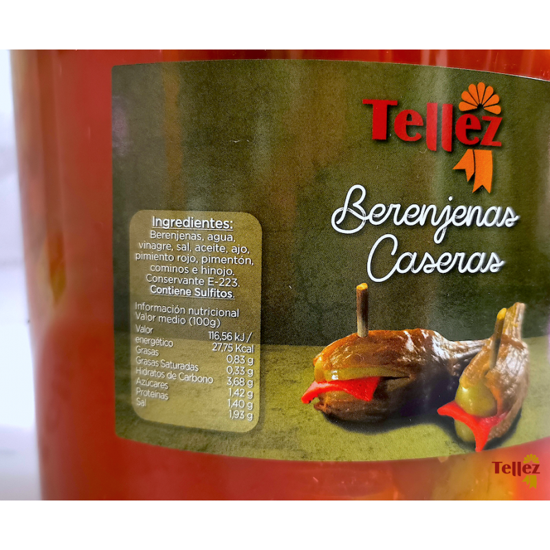 Berenjenas caseras embuchadas con pimiento rojo, inojo y aceite de oliva . Todos ellos le proporcionan un sabor sabroso, intenso y delicioso.