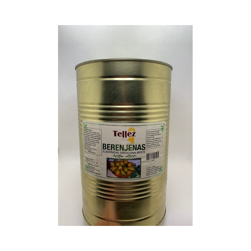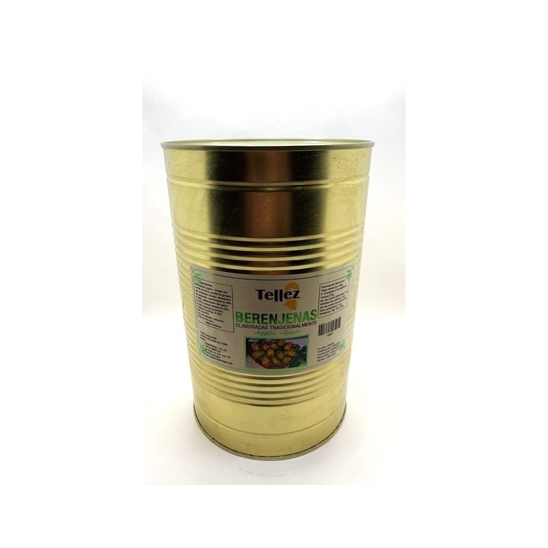 Berenjenas embuchadas con pimiento e hinojo con sal, vinagre, sal, aceite de oliva y aceite de girasol. Sin gluten. Lata de 5 kg bruto y 2kg neto.